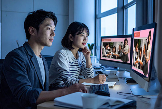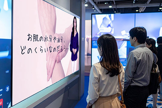 ニュースキャスターが語りかけるように解説する動画で、来場者の興味を惹きつけ、出展の効果を高めます。