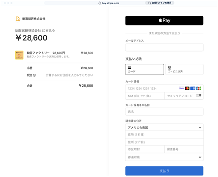 カード決済は、このようなページにて行います。stripe(ストライプ)社のセキュアなシステム・ページに移動してカード情報入力と集金処理が行われ、そのあとstripe社から当社に入金されます。当社サーバーにはクレジットカード情報はいっさい書き込まれません。
