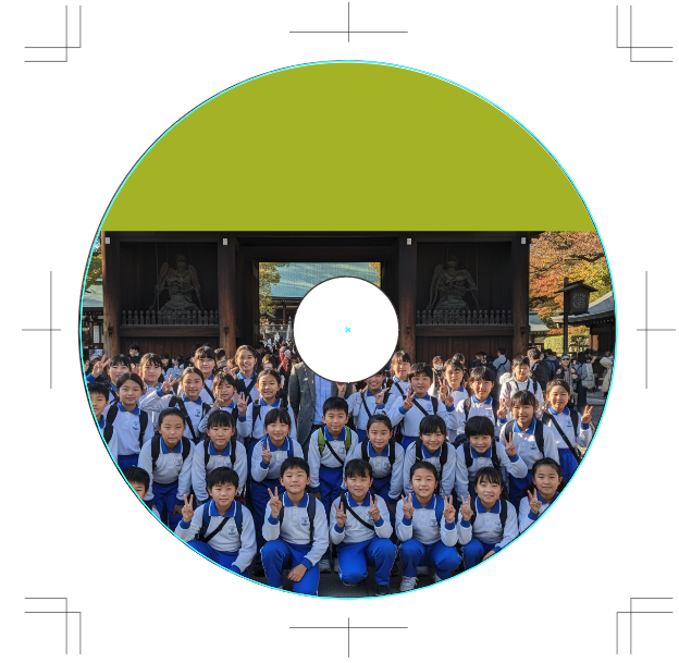 修学旅行や運動会、演奏会などでの集合写真を盤面印刷にご使用される場合、印刷面が円形であり中央に穴が空いているため「写真を盤面の全面に広げる」ということと「全員が入るように配置する」というご要望を同時に適用できないケースが多いです。