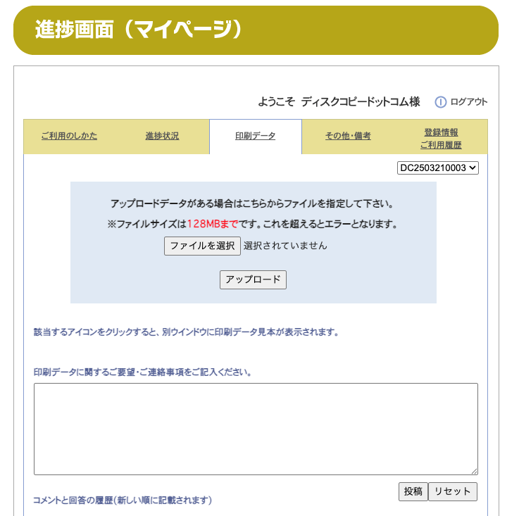 デザインに挿入する写真やイラスト画像などがある場合は、「進捗画面(マイページ)」の「印刷データ」のタブをクリックし、アップロードしてください。一度に128MBまでのファイルをアップロードできます。