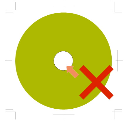 DVD、CDの中央には穴が空いていますが、ここは印刷領域ギリギリまで印刷しなければなりません。したがって、中央には白い円は配置せず、写真やデザインが表示されている状態にしてください(もちろん印刷はされません)。